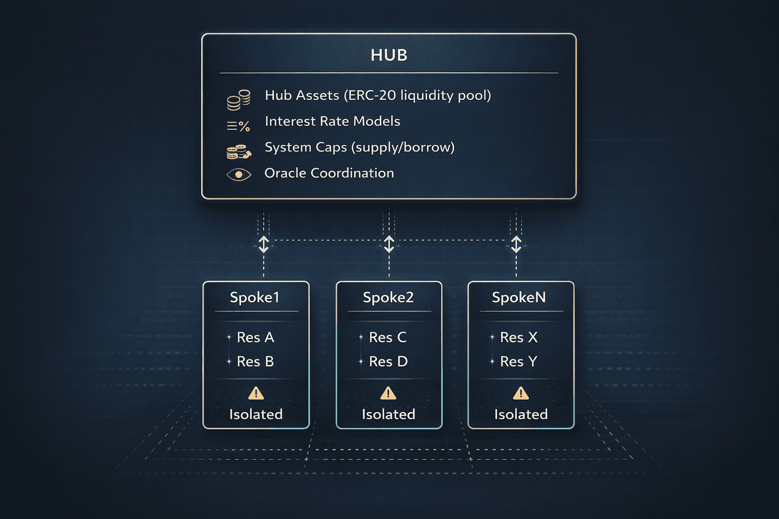 The hub acts as a central liquidity coordination layer while spokes are isolated borrowing modules with independent risk profiles. This design delivers contagion isolation, specialized risk per market, and improved capital efficiency through targeted liquidity allocation.