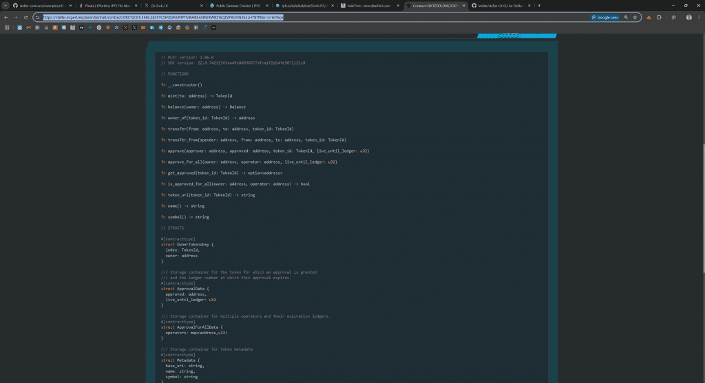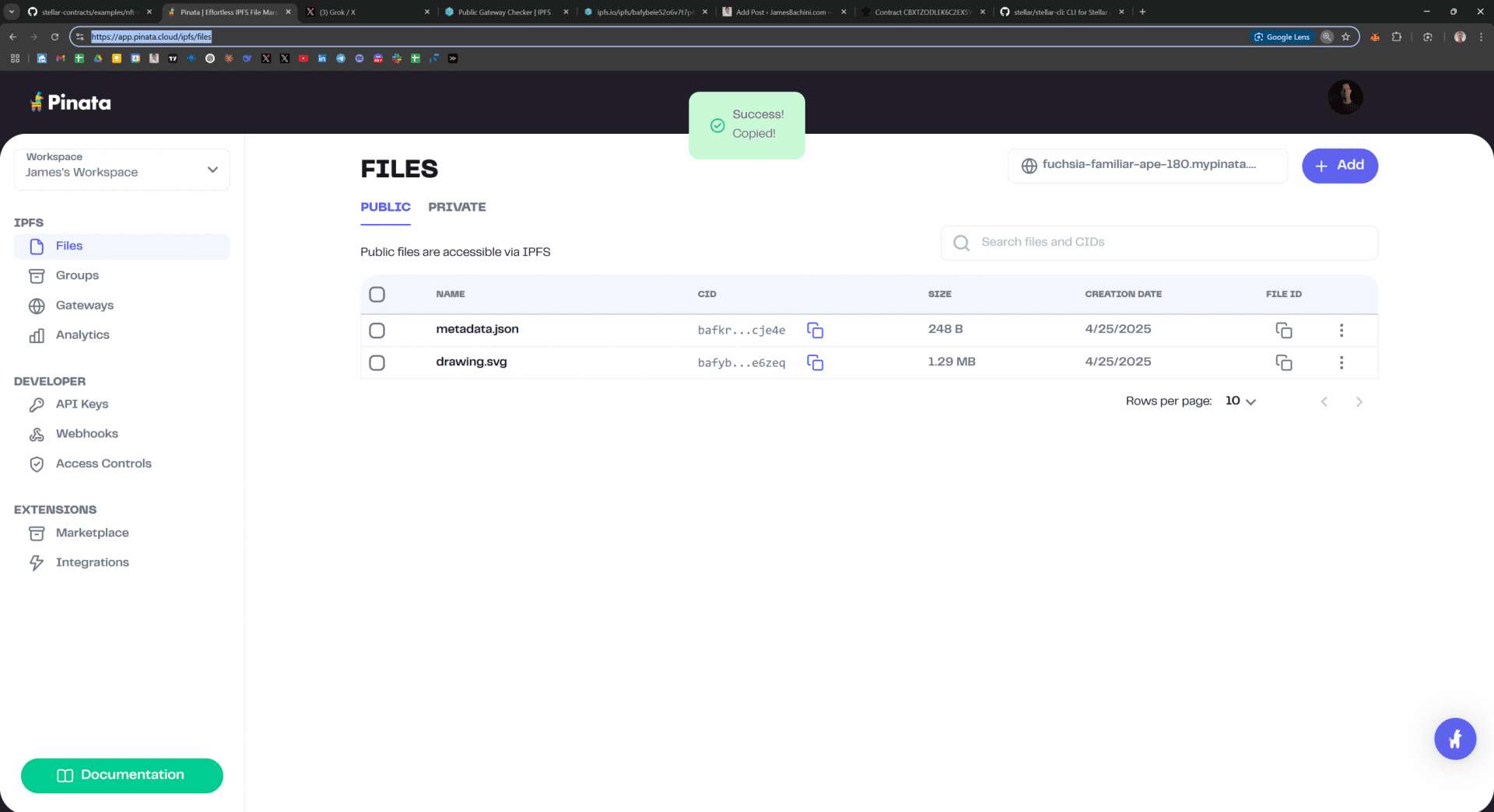 Once we upload the metadata.json we will get an IFPS hash for that as well which we can use as the URI in the Soroban contract metadata.