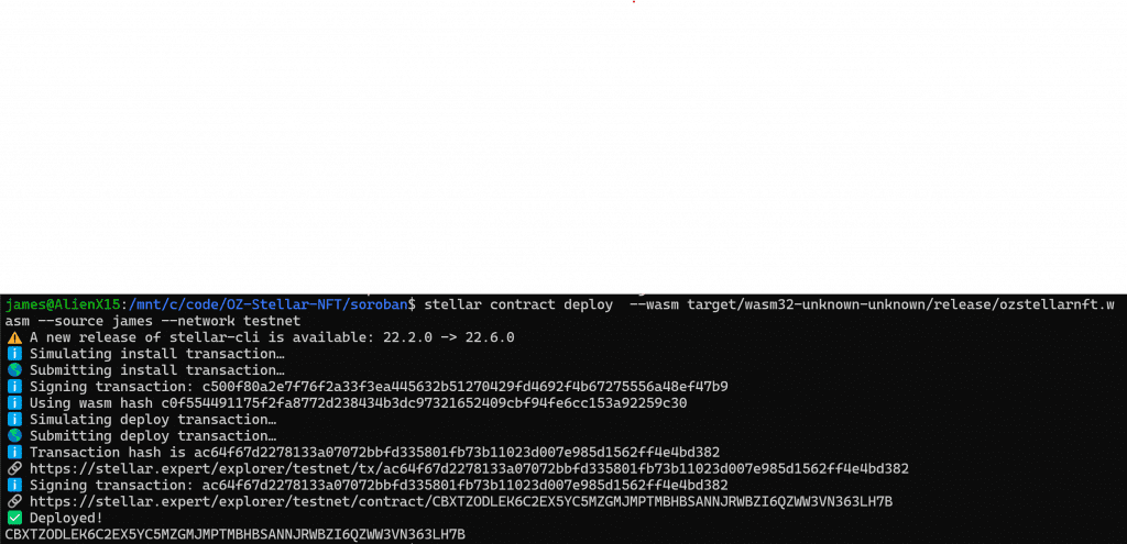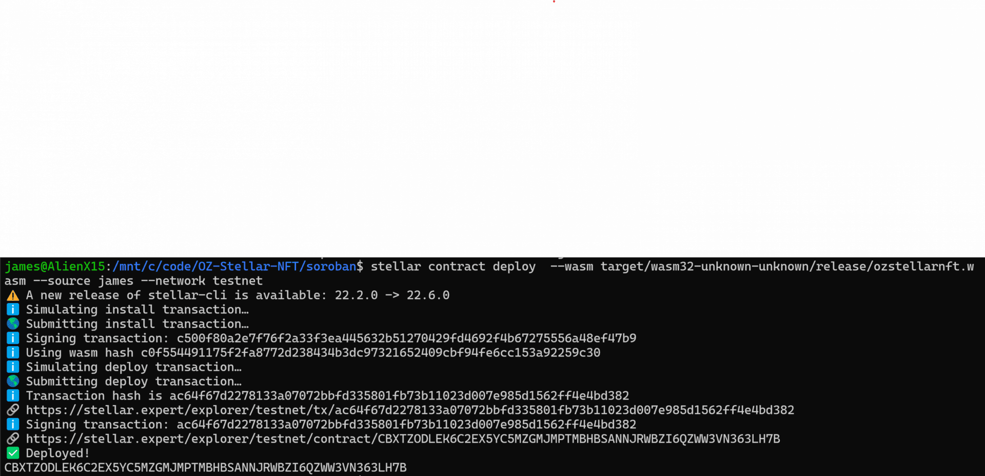 stellar contract deploy --wasm target/wasm32-unknown-unknown/release/ozstellarnft.wasm --source james --network testnet