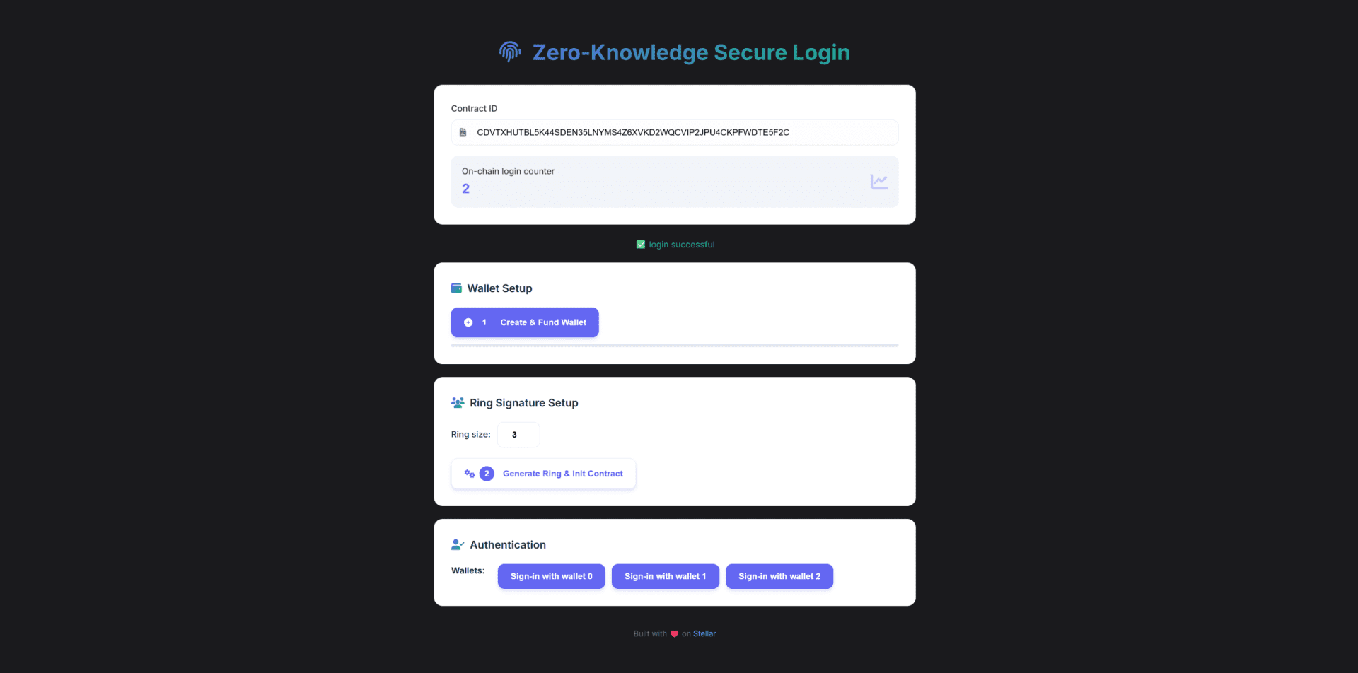Users sign the string “login” with a ring signature; the contract increments a login counter or returns a JWT style capability.