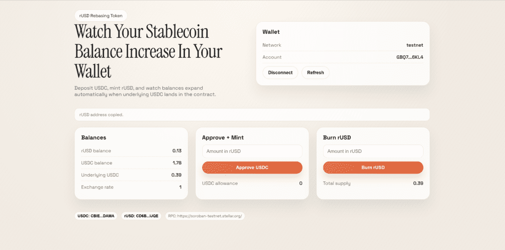 From there it’s the familiar flow: approve USDC → mint rUSD → optionally send USDC directly to the contract address to simulate yield → watch balances rebase.