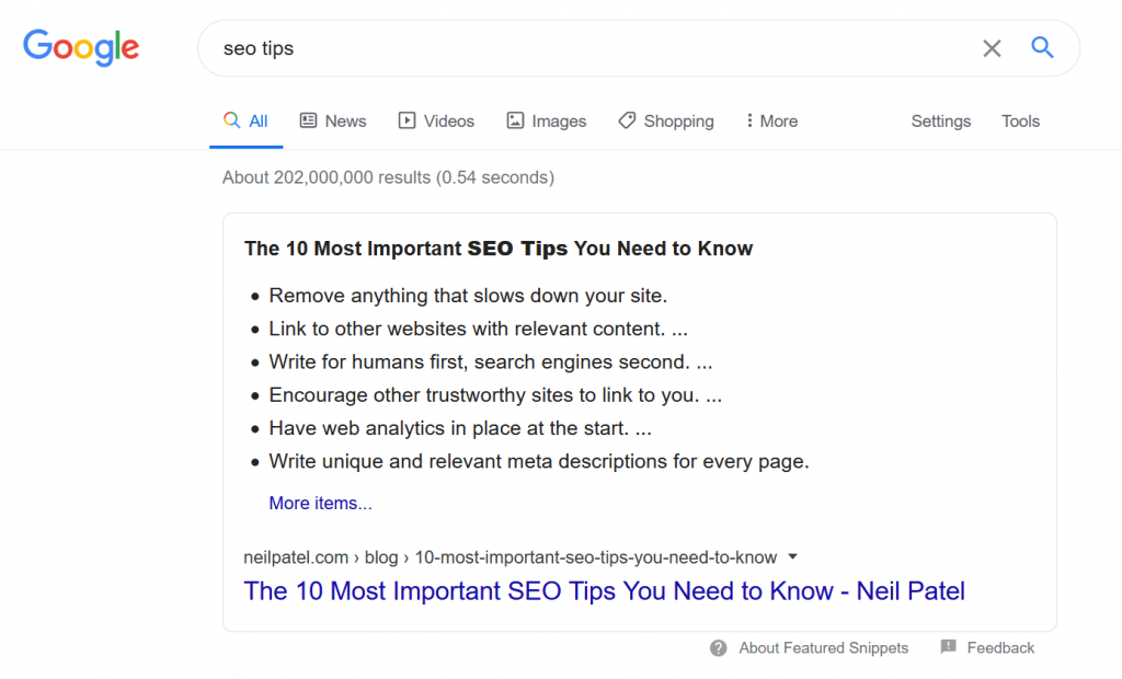 A featured snippet should be informational rather than opinionated. Google wants to show content from authoritative sources that reads like a dictionary. Give the algorithm what it wants and it can jump your page to the top of the SERP’s.