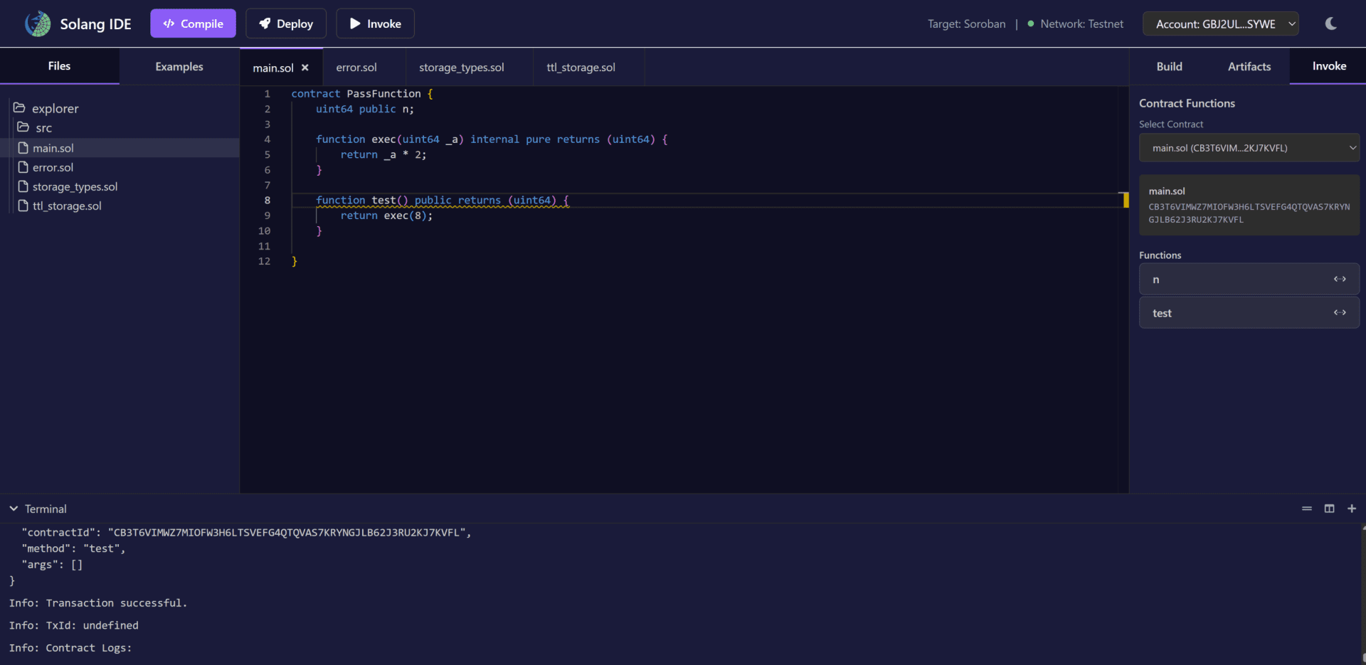 Click Compile. If it finishes without complaint, Solang has accepted your syntax. - Deploy